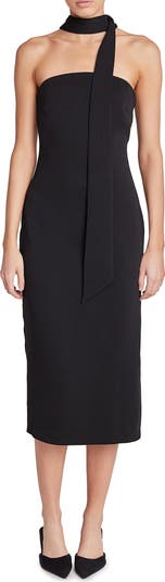 A sophisticated choker neck and a drapey tie accents this shoulder-showing midi made in a figure-skimming silhouette with a sleek racerback.