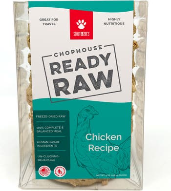 CHOPHOUSE READY RAW: CHICKEN - 9OZ - Scout & Zoe’s Chophouse Ready Raw Freeze-Dried Dog Food – Complete & Balanced, Convenient, Long-Lasting Nutrition for Travel, Emergencies & Daily Feeding. Are you a proud pet parent who understands the benefits of raw feeding but craves convenience without sacrificing nutrition? Look no further than Chophouse Ready Raw Freeze-Dried Dog Food. It’s not just a meal; it’s a revolution in pet nutrition. COMPLETE & BALANCED: Chophouse Ready Raw is meticulously formulated to meet the nutritional needs of your canine companion. Each bite is packed with the essential nutrients your dog requires for a vibrant, healthy life. FREEZE-DRIED PERFECTION: Our cutting-edge freeze-drying process preserves the integrity of raw ingredients while ensuring convenience. No more thawing, messy prep, or concerns about raw food handling. Each patty rehydrates to one pound of food. IDEAL FOR TRAVEL & BOARDING: Chophouse Ready Raw is a game-changer for raw feeders on the go. Traveling or boarding your dog has never been easier or more nutritious. MINIMAL LEARNING CURVE: For pet parents intrigued by raw feeding but wary of the learning curve, Chophouse Ready Raw offers a simple, worry-free solution. No more guesswork; just add water or low sodium broth, serve, and watch your pup thrive. Make the switch to Chophouse Ready Raw and experience the ultimate in convenience without compromising on quality. It’s time to feed your furry friend the raw nutrition they deserve, effortlessly. Elevate mealtime – choose Chophouse Ready Raw today! INCLUDES: (9) 1oz Ready Raw Patties. NET WEIGHT: 9 oz / 255.15 g. 1oz Patty = 1lb of food.