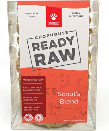 CHOPHOUSE READY RAW: SCOUTS BLEND - 9OZ - Scout & Zoe’s Chophouse Ready Raw Freeze-Dried Dog Food – Complete & Balanced, Convenient, Long-Lasting Nutrition for Travel, Emergencies & Daily Feeding. Are you a proud pet parent who understands the benefits of raw feeding but craves convenience without sacrificing nutrition? Look no further than Chophouse Ready Raw Freeze-Dried Dog Food. It’s not just a meal; it’s a revolution in pet nutrition. COMPLETE & BALANCED: Chophouse Ready Raw is meticulously formulated to meet the nutritional needs of your canine companion. Each bite is packed with the essential nutrients your dog requires for a vibrant, healthy life. FREEZE-DRIED PERFECTION: Our cutting-edge freeze-drying process preserves the integrity of raw ingredients while ensuring convenience. No more thawing, messy prep, or concerns about raw food handling. Each patty rehydrates to one pound of food. IDEAL FOR TRAVEL & BOARDING: Chophouse Ready Raw is a game-changer for raw feeders on the go. Traveling or boarding your dog has never been easier or more nutritious. MINIMAL LEARNING CURVE: For pet parents intrigued by raw feeding but wary of the learning curve, Chophouse Ready Raw offers a simple, worry-free solution. No more guesswork; just add water or low sodium broth, serve, and watch your pup thrive. Make the switch to Chophouse Ready Raw and experience the ultimate in convenience without compromising on quality. It’s time to feed your furry friend the raw nutrition they deserve, effortlessly. Elevate mealtime – choose Chophouse Ready Raw today! NET WEIGHT: 9 oz / 255.15 g. 1oz Patty = 1lb of food.