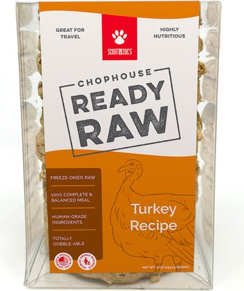CHOPHOUSE READY RAW: TURKEY - 9OZ - Scout & Zoe’s Chophouse Ready Raw Freeze-Dried Dog Food – Complete & Balanced, Convenient, Long-Lasting Nutrition for Travel, Emergencies & Daily Feeding. Are you a proud pet parent who understands the benefits of raw feeding but craves convenience without sacrificing nutrition? Look no further than Chophouse Ready Raw Freeze-Dried Dog Food. It’s not just a meal; it’s a revolution in pet nutrition. COMPLETE & BALANCED: Chophouse Ready Raw is meticulously formulated to meet the nutritional needs of your canine companion. Each bite is packed with the essential nutrients your dog requires for a vibrant, healthy life. FREEZE-DRIED PERFECTION: Our cutting-edge freeze-drying process preserves the integrity of raw ingredients while ensuring convenience. No more thawing, messy prep, or concerns about raw food handling. Each patty rehydrates to one pound of food. IDEAL FOR TRAVEL & BOARDING: Chophouse Ready Raw is a game-changer for raw feeders on the go. Traveling or boarding your dog has never been easier or more nutritious. MINIMAL LEARNING CURVE: For pet parents intrigued by raw feeding but wary of the learning curve, Chophouse Ready Raw offers a simple, worry-free solution. No more guesswork; just add water or low sodium broth, serve, and watch your pup thrive. Make the switch to Chophouse Ready Raw and experience the ultimate in convenience without compromising on quality. It’s time to feed your furry friend the raw nutrition they deserve, effortlessly. Elevate mealtime – choose Chophouse Ready Raw today! INCLUDES: (9) 1oz Ready Raw Patties. NET WEIGHT: 9 oz / 255.15 g. 1oz Patty = 1lb of food.