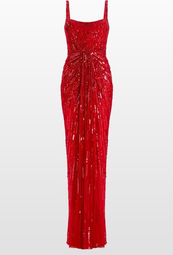 Striking from every angle, this gown is defined by its sharp neckline, structured straps, and a silhouette that elongates and accentuates. Precision-placed sequins cascade vertically from bodice to hem, creating a sense of movement and light play thats effortlessly modern. The waist is softly gathered to add texture and shape, while the overall design delivers clean impact with a high-shine finish.