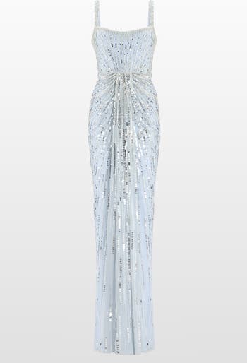 Striking from every angle, this gown is defined by its sharp neckline, structured straps, and a silhouette that elongates and accentuates. Precision-placed sequins cascade vertically from bodice to hem, creating a sense of movement and light play thats effortlessly modern. The waist is softly gathered to add texture and shape, while the overall design delivers clean impact with a high-shine finish.