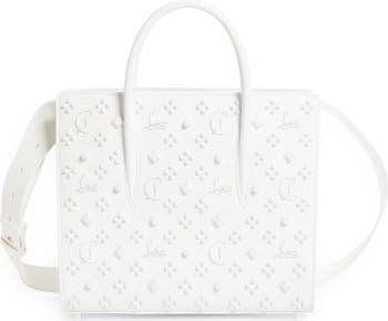 Pops of Louboutin red and debossed-logo panels at the gusseted sides enhance the iconic look of a structured tote crafted from studded calfskin leather. Signature rolled top handles and a detachable shoulder strap allow for multiple carrying options.