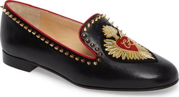 An ornate Christian Louboutin patch heightens the vintage allure of a quintessential smoking loafer outlined in gleaming pyramid studs.
