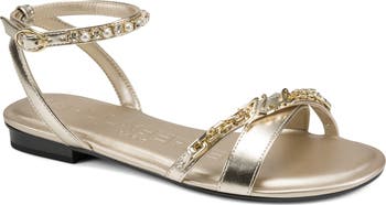 Opulent embellishments and signature logo hardware accent the asymmetric straps on a metallic sandal featuring a cushioned footbed and adjustable buckle closure.
