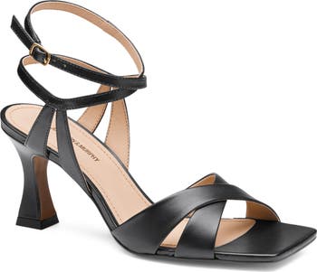 Crisscrossing straps and a squared-off toe bring sharp angles and dimension to a glove leather sandal lifted by a chunky flare heel and secured with wraparound ankle straps. A foam-cushioned footbed with built-in arch support delivers premium comfort.