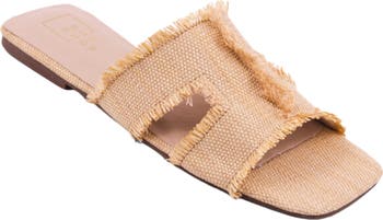 Frayed trim highlights the geometric cutouts of this woven slide sandal grounded by a lightly cushioned footbed for everyday comfort.