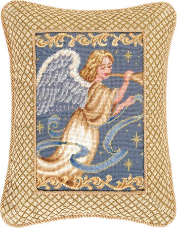 - Add a graceful touch to your seasonal décor with this petite 14"x18" gold accent pillow, perfect for sofas, chairs, or beds. Its angel wings and trumpet horn design create a festive focal point for Christmas and year-round religious displays.