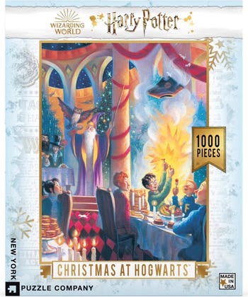 Experience the magic of the holiday season with Christmas at Hogwarts, a bestselling 1000-piece jigsaw puzzle that brings the wonder of Harry’s first Christmas at the castle to life. This beautifully illustrated scene by Mary GrandPré, the original Harry Potter book cover artist, features beloved characters like Professor Dumbledore, Fred and George Weasley, and Harry’s best friend, Ron, gathered in the Great Hall for a festive celebration.\r\n\r\nPerfect for Harry Potter fans, this puzzle is an enchanting gift that captures the warmth and whimsy of Hogwarts during the holidays. Crafted from high-quality recycled chipboard and featuring a premium linen-style finish to reduce glare, Christmas at Hogwarts delivers a satisfying and magical puzzle experience.
