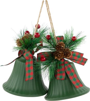 Add a traditional touch to your holiday decor with these green Christmas bell ornaments adorned with pine and plaid bows. These charming accents with berries and pinecones, bring a festive spirit to your home. Just perfect for hanging on your Christmas tree. Embrace the season with these timeless and sophisticated decorations. Features: Set of 2 Christmas jingle bell ornaments Matte green finish embellished with red and green plaid bow Accented with pine needles, pinecones, and berries Each includes a jute twine rope for hanging Indoor use recommended Dimensions: 7"H x 5.5"W x 3.5"D Material(s): metal/jute/plastic/fabric