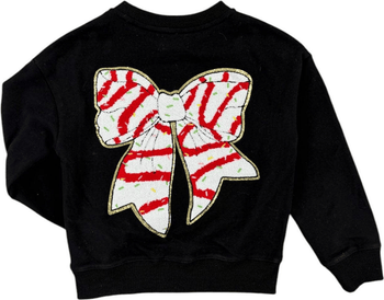 Festive black sweatshirt featuring a bold candy cane-striped bow on the back with gold accents for a holiday-ready look Classic crewneck design with ribbed cuffs and hem, plus a small embroidered red heart on the front for a subtle touch Perfect for celebrating the season in style, whether at holiday gatherings or adding a fun twist to everyday wear