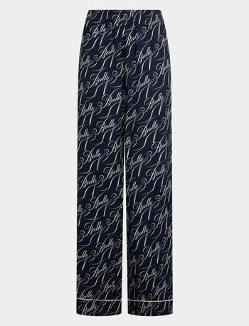 Part of the Christmas Capsule collection, these pants are emblazoned with an all-over Bally Heel logo print in white on a navy blue viscose twill base. Piping profiles the cuffs of these high-waist trousers.