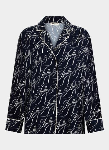Part of the Christmas Capsule collection, this viscose twill shirt is emblazoned with an all-over Bally Heel logo motif, printed in white on a navy blue. White piping profiles the cuffs, collar and placket.
