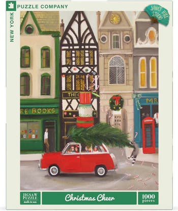 The Peppermint Family spread a little Christmas Cheer in this 1000 piece puzzle by the beloved artist Janet Hill. This enchanting scene transports you to a quaint street bustling with holiday spirit, where cheerful shops line the cobblestone road. Amidst the festive errands, the Peppermint family's car is piled high with presents, and a Christmas tree reveals a surprise tag-along passenger—a mischievous raccoon nibbling on candy canes. This delightful puzzle captures the joy and charm of the season, offering a heartwarming challenge for the whole family.