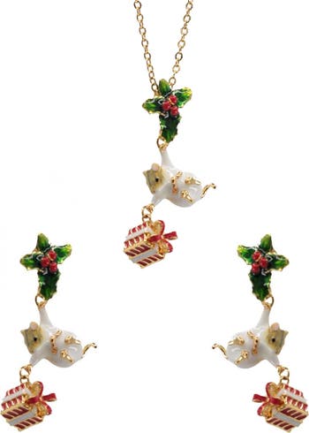 This adorable pendant and drop earring set features a field mouse clutching a present, suspended beneath a festive sprig of holly. The intricate hand-painted enamel brings this delightful set to life. Finished with a rich gold plating and presented in a complimentary box it makes the perfect gift this Christmas.Style with the matching Christmas Mouse wreath brooch.
