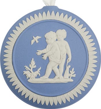 This annual ornament is handcrafted from Jasperware and adorned with an intricately designed relief and suspended from a stitched, chequered ribbon made from soft fabric.