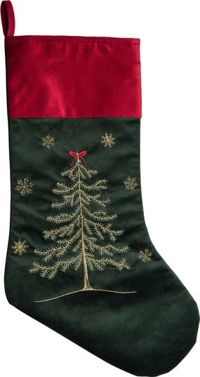 - Features a classic emerald green body with shimmering gold embroidered Christmas tree and snowflakes, accented by a bold red top cuff. This design brings timeless sophistication and warmth to your living room or fireplace holiday décor.