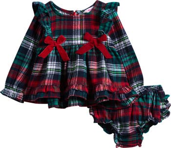 Signature ruffles and velvet bows add to the fun of this plaid dress and matching bloomers set that will have baby looking festive in the comfort of soft cotton.