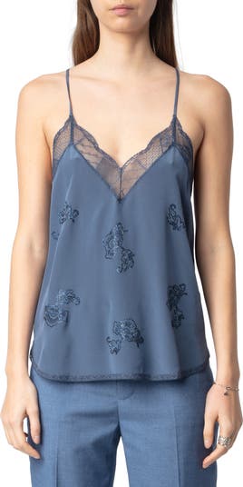 Scattered blooms of sparkling crystals illuminate a racerback cami made from fine silk and edged in airy lace to advance the romantic look.