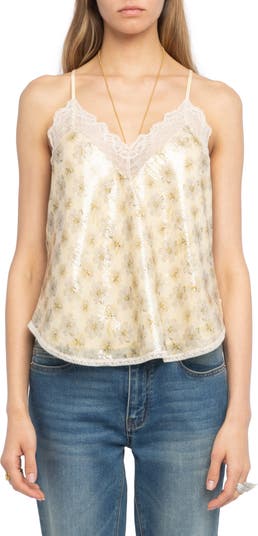 This lace-trimmed cami shimmers with sequins layered over a delicate floral print for a look that's equal parts captivating and romantic. It's an easy statement piece that brings texture, shine and edge to evening looks.