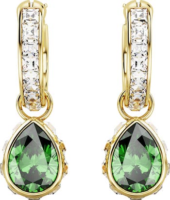 Square-cut crystals trim the hoop and pendant of these stunning drop earrings anchored by faceted pear-cut zirconia in a rich emerald hue.
