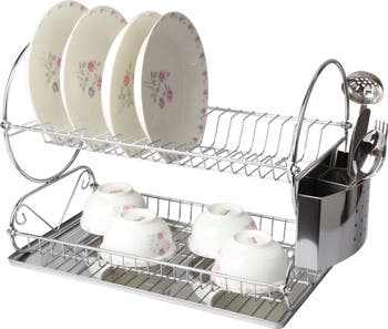 Simplify the task of drying your dishes with the Mega Chef Dish Rack! This rack holds all your hand-washables so drying is organized and efficient. This rack features a utensil holder, draining tray, two tiers, slots for plates and space for cups and bowls. In stylish chrome finish.