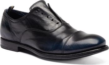 Shaped in Italy with artisanal precision, this leather oxford offers a refined laceless silhouette with a distinctive navy-to-black patina that sets it apart. A grosgrain heel pull tab and almond toe bring understated elegance, while a stacked rubber sole delivers durable, all-day comfort.