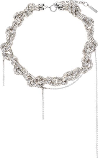 Tennis strands and strung from crystal-covered oversize links to completely dial up the glam of this palladium-dipped necklace.