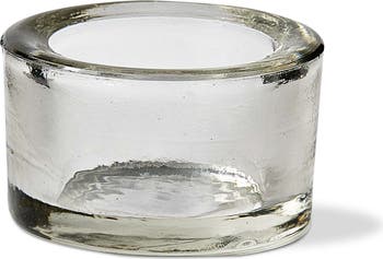 - Chunky tealight holder made of hand-blown clear glass measuring 1.5 inches in height and 2.5 inches in both length and width.