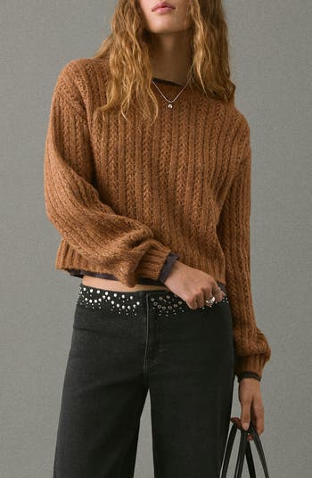 Chunky stitches lend lightweight warmth and a cozy look to this cropped, relaxed-fit sweater that's ready for cool-weather layering.