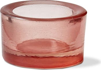 - Chunky tealight holder made of hand-blown recycled glass measuring 1.5 inches in height and 2.5 inches in width.
