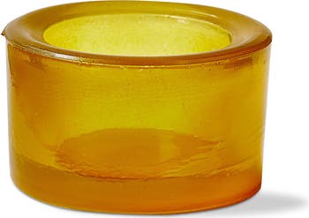 - Chunky tealight holder made of hand-blown recycled glass in vibrant yellow measuring 1.5 inches high by 2.5 inches long and 2.5 inches wide.