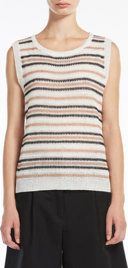 Feel cool and look polished in this sleeveless linen sweater that's wrapped in neutral-hued stripes.