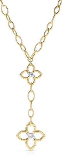 Pavé diamond settings swirl around the center of two flower pendants that endlessly gleam on this stunning chain necklace cast in 18-karat gold.