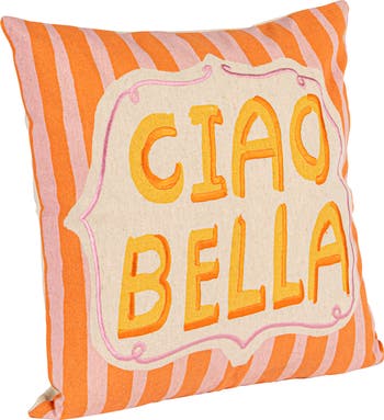 - A cheerful yellow and white cotton pillow that says "Ciao Bella," welcoming everyone with a bright smile