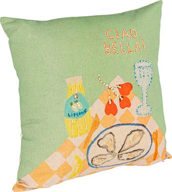 - A charming invitation to comfort, this pillow features a picturesque tablescape and the embroidered greeting "Ciao Bella!" in vibrant hues