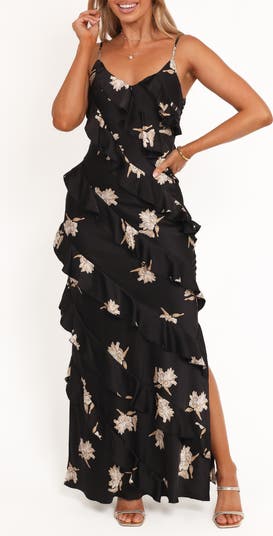 Ravishing ruffles cascade in a spiral down this dreamy maxi dress made from slinky satin in a romantic floral print.