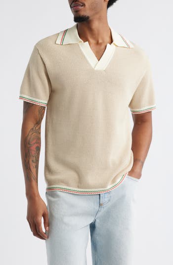A contrasting johnny collar and trim enhance the sporty good looks of a sweater knit with open stitching for an airy feeling you'll enjoy every time you wear it.