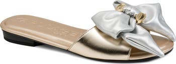 Logo-engraved hardware centers the shimmering bow at the toe of a chic slide.