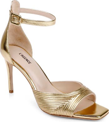 Step up your special-occasion style with this metallic ankle-strap sandal complete with a stiletto heel and memory foam cushioning.