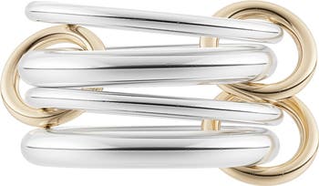 Shiny bands of sterling silver are connected by 18-karat gold links on this sculptural ring that can be worn spread across multiple fingers.