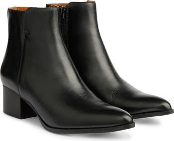 Streamlined modern style defines this smooth leather bootie lifted by a just-right block heel.