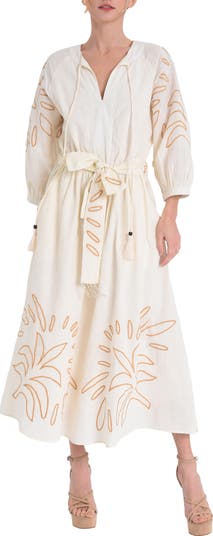 Leafy embroidery plays up the casual, contemporary charm of this airy cotton A-line dress.