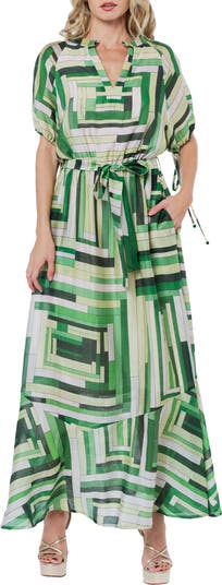 A geometric print stands out on this linen-enhanced maxi dress made with ruched puff sleeves, side-seam pockets and a removable tie belt.