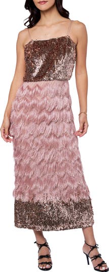 Shimmery sequins and flowy fringe dial up the drama of this party-ready midi dress.