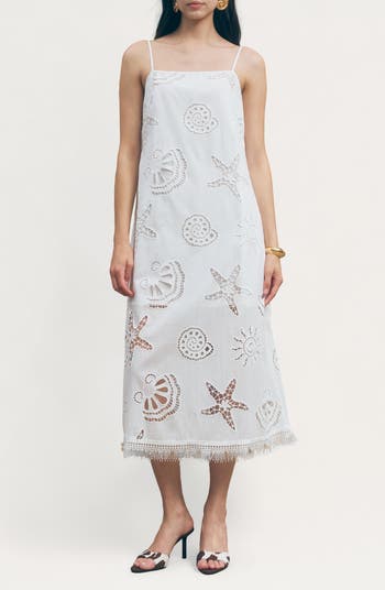 Airy cotton eyelet takes the form of ocean-inspired motifs on this slip-style midi dress finished at the hem in delicate fringe.