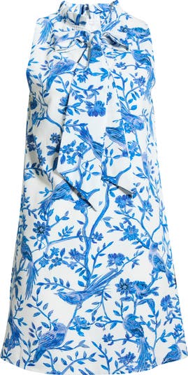 Fresh and playful, this floral-print minidress is designed with a high ruffle mock neck and an easy A-line silhouette that swings when you walk. A tie detail at the neck adds a charming finish, bringing extra personality to the breezy shape.
