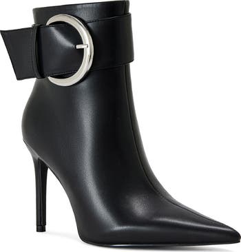 An oversized buckle strap puts a contemporary-chic spin on this lofty stiletto bootie complete with a pointy toe.