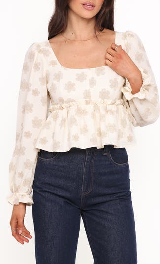 Pretty flowers cover this charming square-neck top framed by billowy long sleeves and a flouncy peplum at the hem.