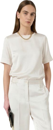 The Cileia top adopts the simple cut of a t-shirt, but its satin material gives it a sophisticated twist. A piece that will elevate jeans or enhance a suit.
